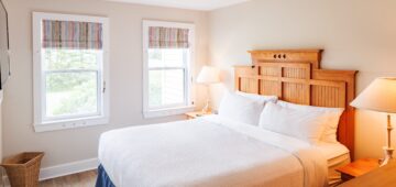 Located in a duplex-style 2-unit building are our two story, two-bedroom cottages, some with water views. The second level offers one bedroom with a king featuring an ensuite bathroom, a second bedroom with 2 queen beds, and a fully equipped five-piece bathroom. The main level living room features an electric fireplace, complimentary Wi-Fi, access to the indoor pool and sauna, and a refreshing stand-up shower. A double pullout sofa and is adjacent to a full kitchen complete with a stove, fridge, dishwasher, dishes, microwave, and breakfast bar with stools. These cottages also are equipped with a private screened in deck.